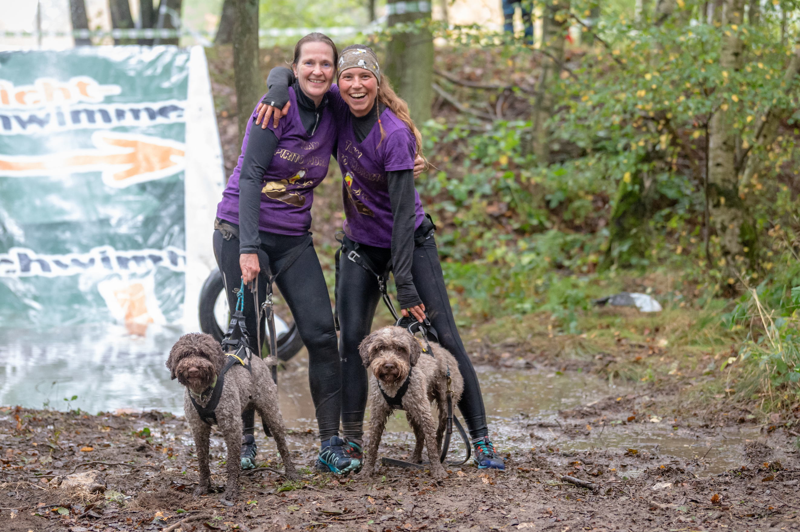Gino und Siri mit ihren beiden Ladys waren im Schlamm unterwegs… Das Team Spirito Morasti hat zugeschlagen und das Bild drückt die Freude aus, die sie am Ziel hatten… Rennen mit Hindernissen und Schlammbädern… eigentlich gemacht für Lagotti, sofern
